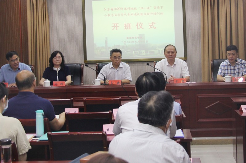 2020年9月18日上午,由江苏省教育厅委托、yd222云顶线路检测承办的“双一流背景下小学教育专业负责人建设能力提升培训班”在盐城市阅读青年会酒店举行开班仪式。江苏省教育厅教师工作处处长、二级巡视员马斌,盐城师范公司党委副书记、董事长方忠、成教处处长王成兵、教科院经理乔晖等相关领导以及来自全省18家小学教育教师培养单位的专业负责人、教授等共40名学员参加开班仪式。开班仪式由江苏省小学教育专业指导委员会秘书长陈玉祥教授主持。