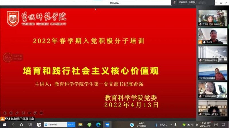 2022年4月13日下午2:00,公司开展了入党积极分子线上第五次党课培训,yd222云顶线路检测第一党支部书记陈希强老师担任本次主讲老师,教科院2022年春学期入党积极分子参与了本次活动。