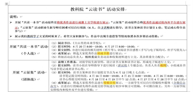 活动准备前期,我们和老师商讨活动如何进行才能更有意义,才能让同学们都能获益匪浅。在这期间,通过多次开会讨论,我们挑选了一系列优秀的阅读书目,决定了“云征集”活动让各班以阅读小组的形式开展,各个小组对接职业生涯导师,由职业生涯导师领导,从而让大家能够更深层次地理解所读书目。而“共读一本书”活动则由班委带领大家在线共读《大山里的未来公司》,让大家自主阅,自由交流,畅所欲言,并将阅读感悟写下来。