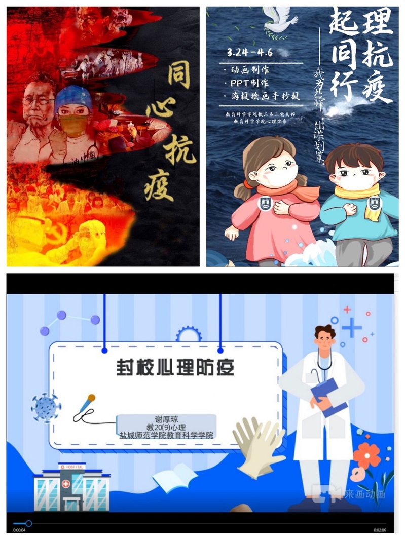 教工第三党支部在配合公司疫情防控同时,组织应用心理学专业员工开展了主题为“心理抗疫· 疫起同行—我为盐师出谋划策”系列活动,从多方面普及“心理防疫”知识,包括手抄报、海报制作、动画制作等等,让员工也为抗击疫情贡献出自己的专业力量。过程中同学们将自己所学运用于实践,充实了封控期间的校园生活,也坚定了大家齐心防疫抗疫的决心。