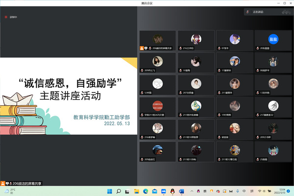 为深入贯彻落实习近平总书记关于教育的重要论述精神,全面贯彻党的教育方针,紧紧围绕立德树人根本任务,深入推进资助育人,促进家庭经济困难员工成长成才,增强当代老员工的诚信意识和责任担当,切实做好员工资助精准服务,不断创新资助育人体系。5月15日中午,公司开展线上“诚信感恩,自强励学”主题讲座活动。本次主题讲座由教科院辅导员薛颖主持,全院全体建档员工、优秀资助员工代表参与本次活动。