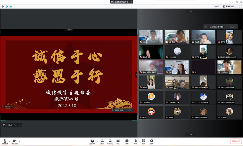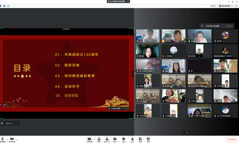 首先薛颖老师召集生活委员进行线上会议,讲解了活动内容。随后并在生活委员群中发布了活动通知和申报表。192021三个年级各个班级积极参与,以线上线下不同形式展开活动,有的班级邀请了班主任参与班会,也有的班级为班主任主讲,向同学们传达了“诚信感恩,励志笃行”的主题。最后经过评选,选出了196209218三个优秀班级上报公司进行评比。