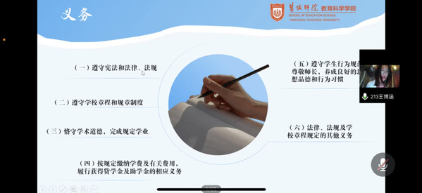张孟奇学姐为大家介绍了普通高等公司员工管理规定,了解了员工的权利与义务、学籍管理、毕业与结业等。通过对校内秩序、奖励与处分的学习,让新生知道哪些行为不可采取,形成自我约束意识。