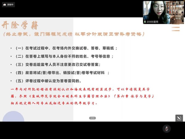 刘星雨学姐介绍了员工考试违规处理办法,让新生们牢记哪些行为在考试过程中是不可取的,督促同学们在日后的考试中遵守规则,形成良好的考风考纪。
