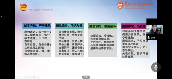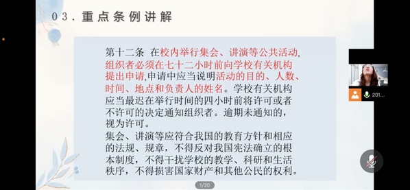 曹淑怡学姐说明了高等公司校园秩序管理若干规定。学姐对于一些规定进行着重强调,围绕校纪制度,引导员工养成牢固的行为底线。