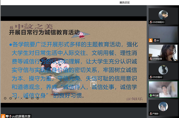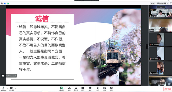 首先,各班级主持人带领同学们了解了诚信和感恩的概念,通过引用经典书籍中的名言,让同学们对于诚信和感恩的概念有了更加清晰的认识。接着各班级同学通过观看教育诚信视频、名人经典语录、讲述关于诚信感恩的故事等方式,强化了对日常生活重人际交往、文明用餐、理性消费等诚信行为的认识和理解。最后,各班级主持人对同学们发出号召,呼吁同学们要常怀感恩之心,行诚信之举。