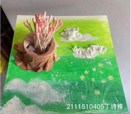 在活动现场,同学们展现自己的想象力与动手能力,利用各种材料制作出精美的作品。2011班姚凯伟同学通过裁剪废弃纸板做出了一个挂牌的基础样式,接着用彩笔在白纸上绘制出可爱的图案上色后剪下来粘贴在纸板上,稍加修缮,一个可爱的作品就完成了。219班的孙晓宇同学利用超轻粘土捏出了“树林的一角”,色彩的搭配和整体的画面十分和谐,作品也是充满了童真童趣。