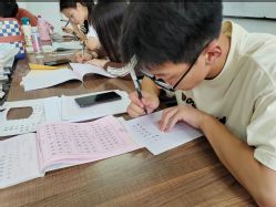 钢笔字、粉笔字方面:最重要的就是“练”。除了每天要吸收老师课堂上所讲的字形结构、用笔技巧之外,更要多加练习,多和老师交流沟通,同时跟着字帖慢慢去调整不规范的字形结构,在质量跟上之后,再去追求速度。因为比赛时只有八分钟时间,所以后期主要练的是速度,而前期一定要慢下来保障每一个字的质量。