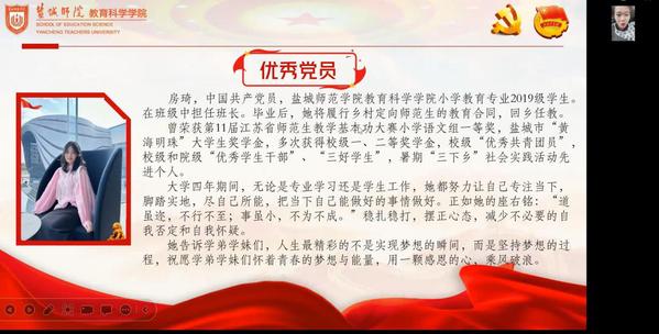 接着,房琦学姐为大家讲述她的两段特别经历。在党旗前宣誓时,她领悟到成为一名中国共产党员,不是努力的终点,而是一个新的开始。从受党关怀长大的懵懂少年到思想成熟的新时代青年,这是一段漫长的道路,更是一条学习的道路,也是一条成长的道路。必须夯实自身修养,更好的为人民服务。在备战江苏省教师基本功大赛期间,她感受到来自老师、舍友的关心照顾。她认为,我们要懂得感恩,在党的领导下,发挥我们青年的力量,抓住机遇、迎难而上、有所担当,有所理想。
