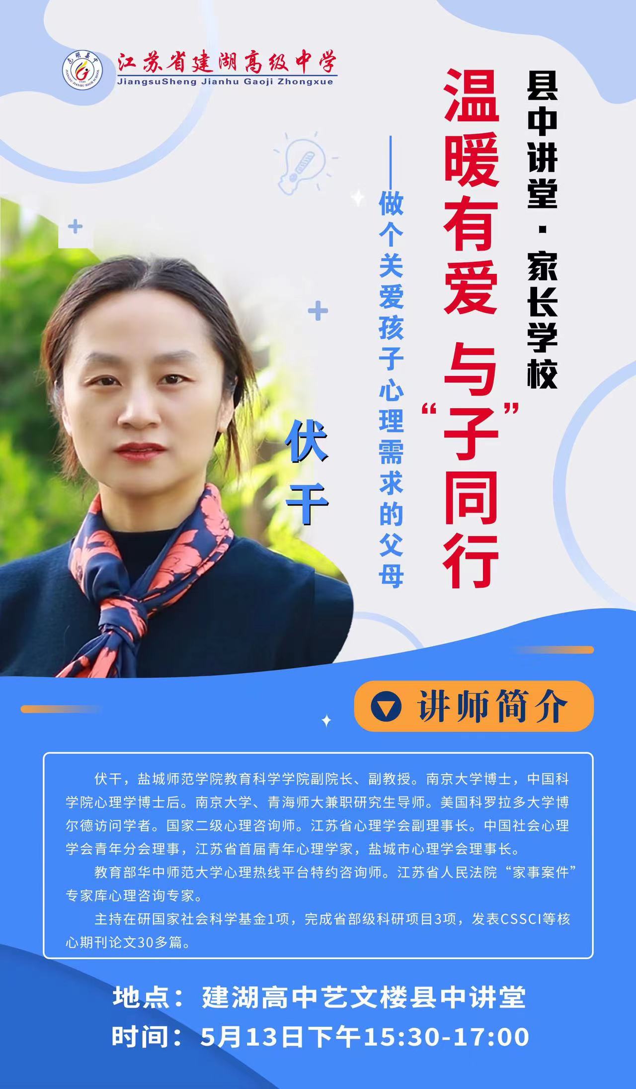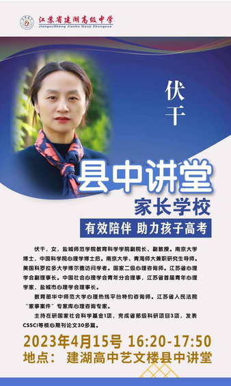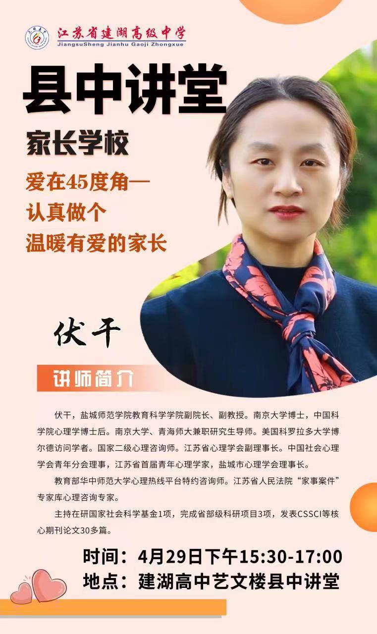 4月15日至5月13日,盐城市心理学会理事长、yd222云顶线路检测副经理伏干博士受邀为建湖高级中学“县中讲堂 家长公司”开展家庭教育讲座。此次讲座为建湖高级中学的家长和员工带来了新的教育思维,为推动家校共育注入新的动能。