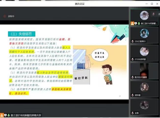 5月22日,开展了线上“诚信还贷,共筑未来”诚信还款确认活动,负责人闵唐馨向参与建档的同学们介绍了国家助学贷款政策,以及申请贷款和偿还贷款的注意事项,其中再次强调了珍惜征信、诚信还贷的重要性和必要性,提醒申请贷款的同学们珍惜个人信用,维护信用记录,毕业时按时还款,不要产生信用污点影响自己未来升学、职业生涯等方面。