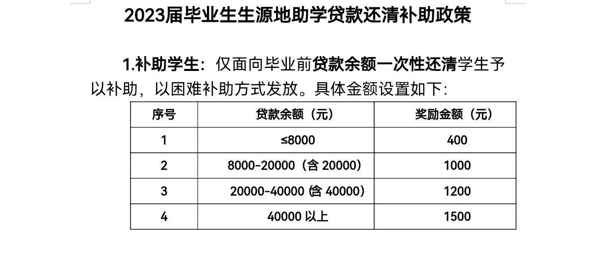 此外,为鼓励毕业生提前还款,公司面向毕业前一次性还清贷款余额的员工予以补助,具体补助金额400元-1500元不等。该政策有效鼓动了贷款毕业生们提前还款的积极性。