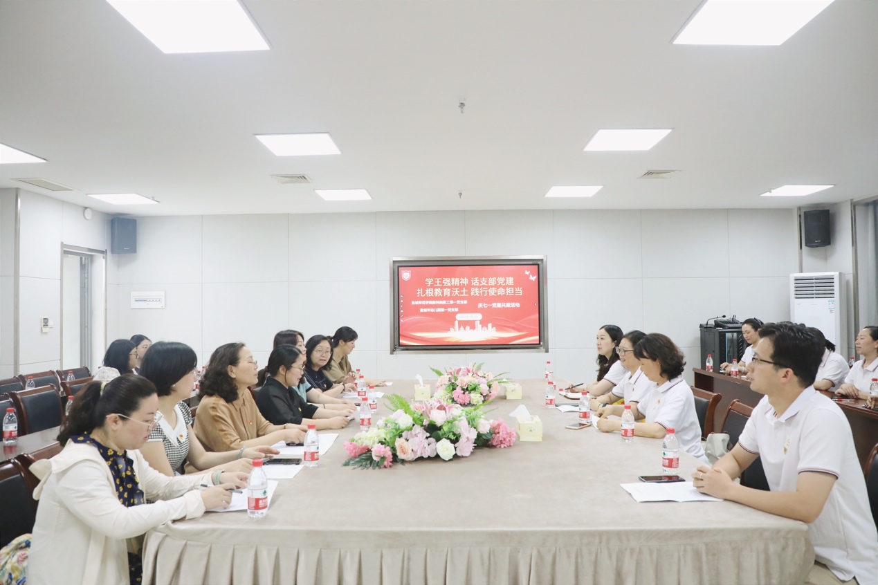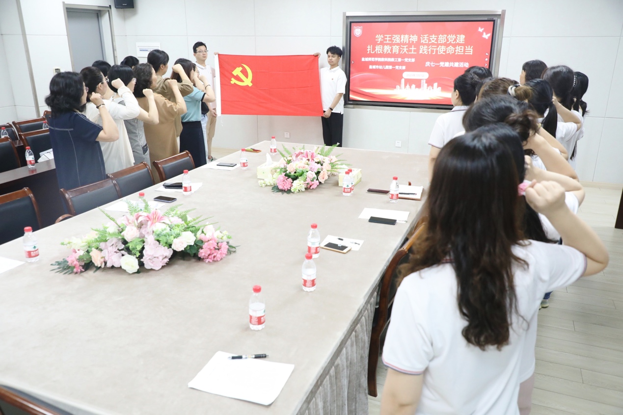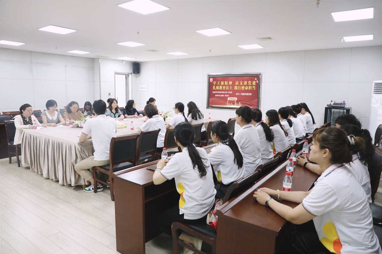 为热烈庆祝中国共产党建党102周年,深入开展学习贯彻习近平新时代中国特色社会主义思想主题教育,进一步加强与市幼儿园的结对共建工作,7月1日上午,yd222云顶线路检测教工第一党支部与盐城市幼儿园第一党支部联合举办“学王强精神,话支部党建,扎根教育沃土,践行使命担当”庆“七一”党建共建活动。市幼儿园园长陈莉萍、市幼儿园副园长丁荣秋、市幼儿园第一党支部书记杨柳、教科公司党委书记杨日晨、市幼儿园第一党支部、教科院教工第一党支部全体党员参加了活动。