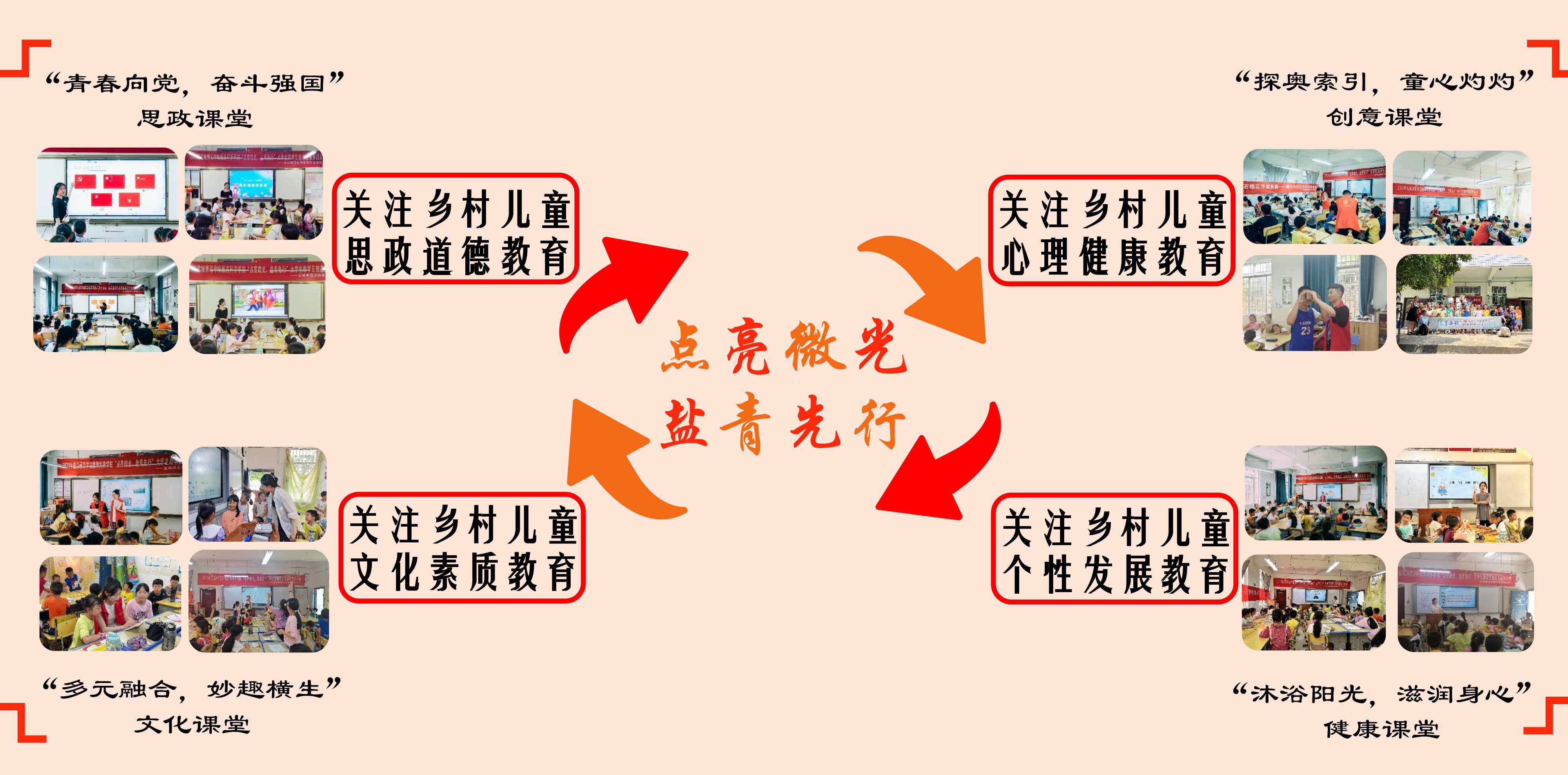 在公司党委和上级团组织的正确领导下,“点亮微光 盐青先行”志愿服务团秉持“扎根中国大地办教育,伴随乡村孩子同成长”的服务理念,以党员为核心、团员为助手,以社会实践活动为切入点,53名师生先后奔赴广西壮族自治区桂林市灵川县海洋乡、宁夏回族自治区中卫市海原县(国家乡村振兴重点帮扶县)、贵州省晴隆县碧痕镇东风村(国家乡村振兴重点帮扶县)、贵州省黔南州惠水县、河南省焦作市解放区等10个地区聚焦“四个关注”实施“四大课堂”,针对“两个核心”提出“六条建议”。