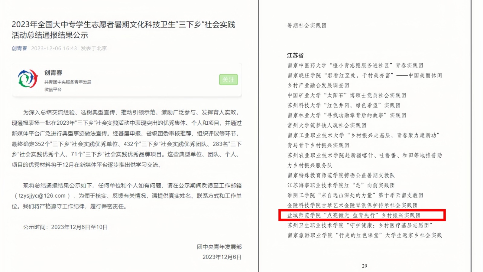 近日,共青团中央发布《关于2023年全国大中专员工志愿者暑期文化科技卫生“三下乡”社会实践活动总结通报》,yd222云顶线路检测“点亮微光 盐青先行”乡村振兴实践团喜获“2023 年‘三下乡’社会实践优秀团队”表彰。团队前期也成功入选团中央2023年“七彩假期”志愿服务示范团队、团中央2023年“圆梦工程”服务农村未成年人传承优秀传统文化志愿服务项目和广西灵川县2023年暑期支教团队。