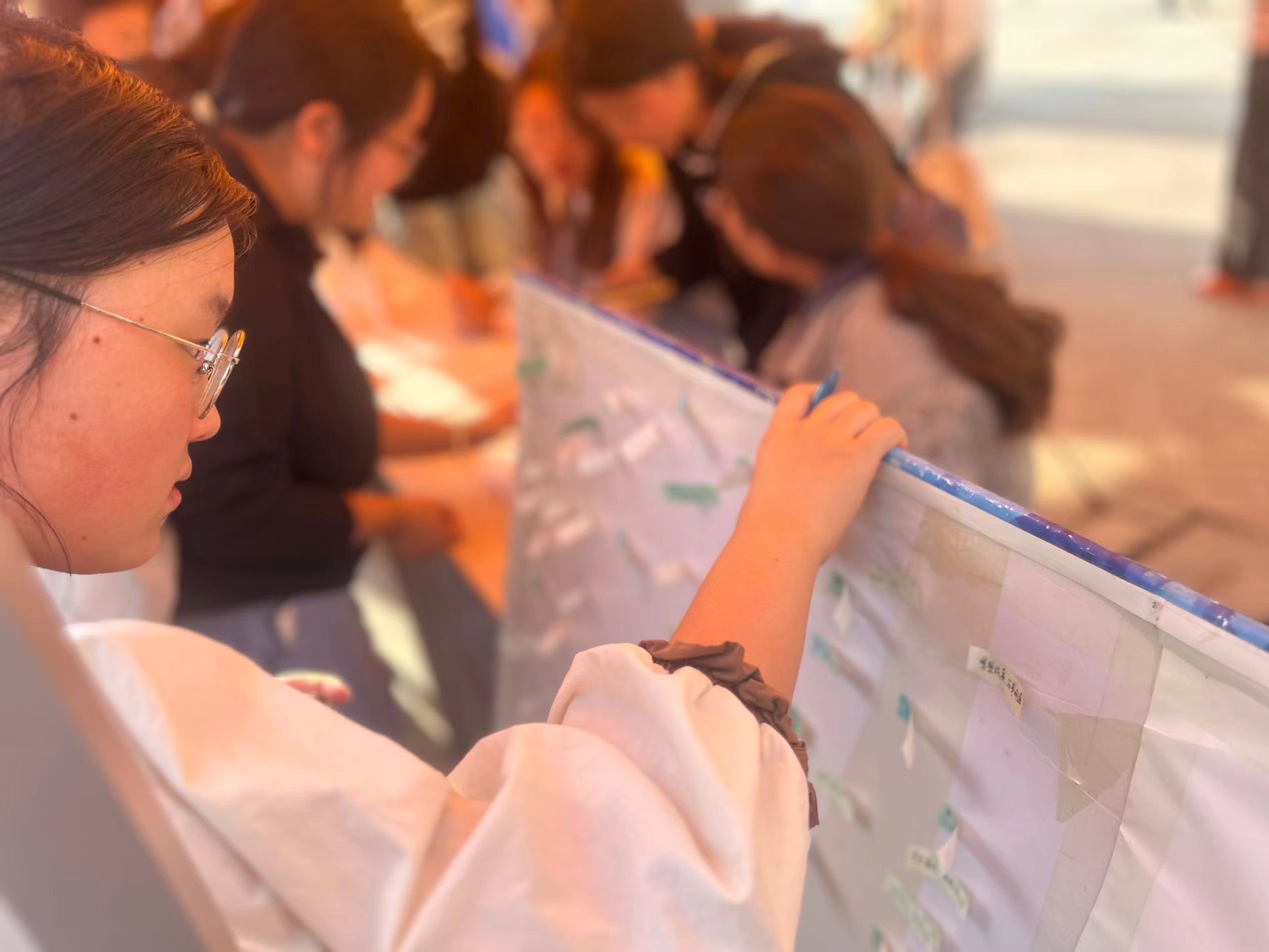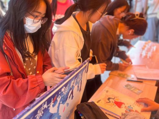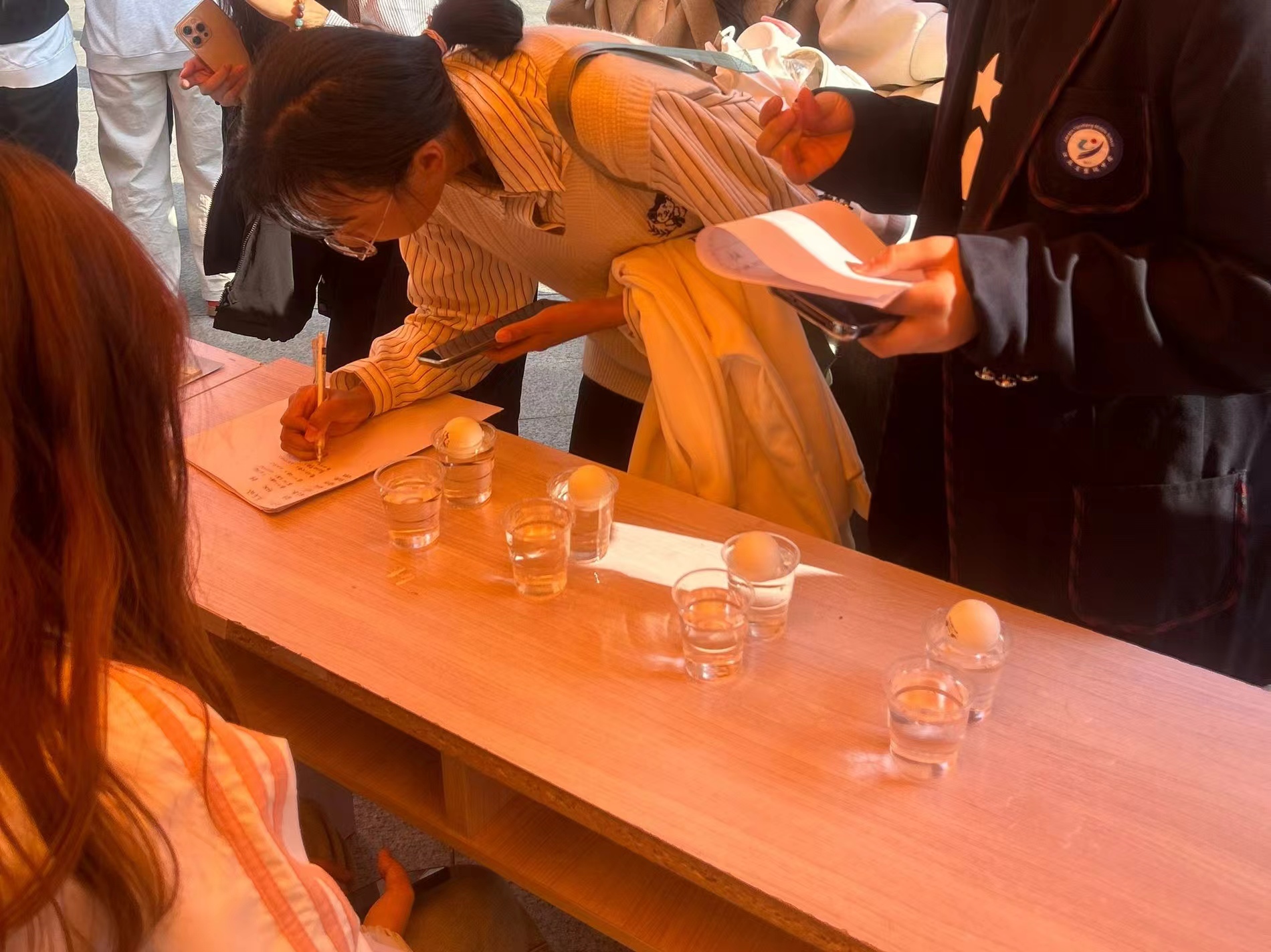 “吹走不开心”活动趣味十足。参与人员需要吹动盛有水的杯子上的乒乓球,使其顺利落入下一个杯子,每人拥有两次机会。活动现场气氛异常热烈,同学们在游戏的过程中尽情释放压力,收获满满的快乐。