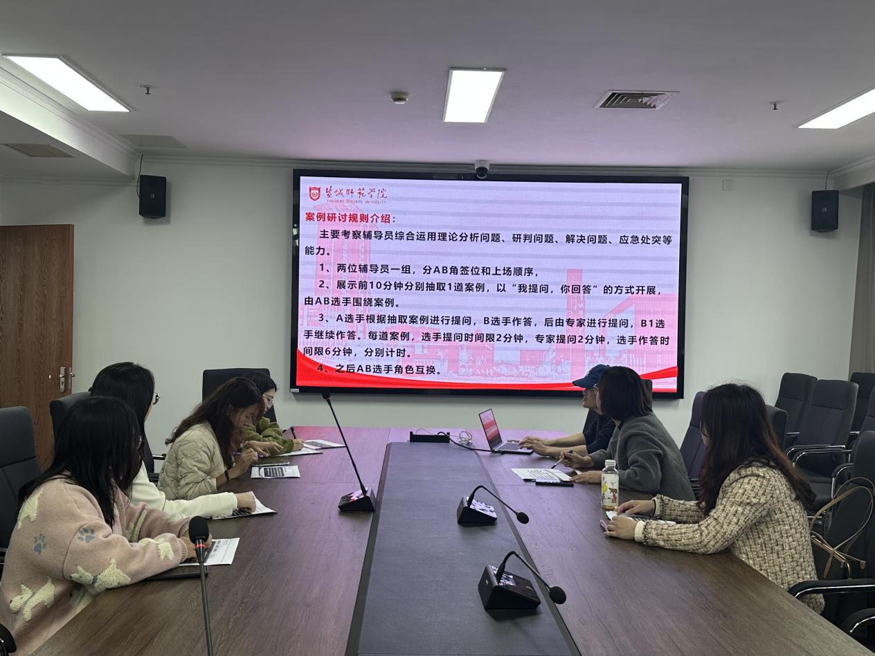 本次初赛分案例分析与谈心谈话两个环节。比赛现场,参赛选手围绕思想价值引领、心理健康等进行案例研讨,围绕学业压力、奖助评选、岗位实习、职业目标等展开谈心谈话,深入地分析和解答,多思维、多角度、多形式地展示辅导员教育思路、方法和效果。随后,海英从答辩的方法和思路等方面对比赛情况进行分析和点评。