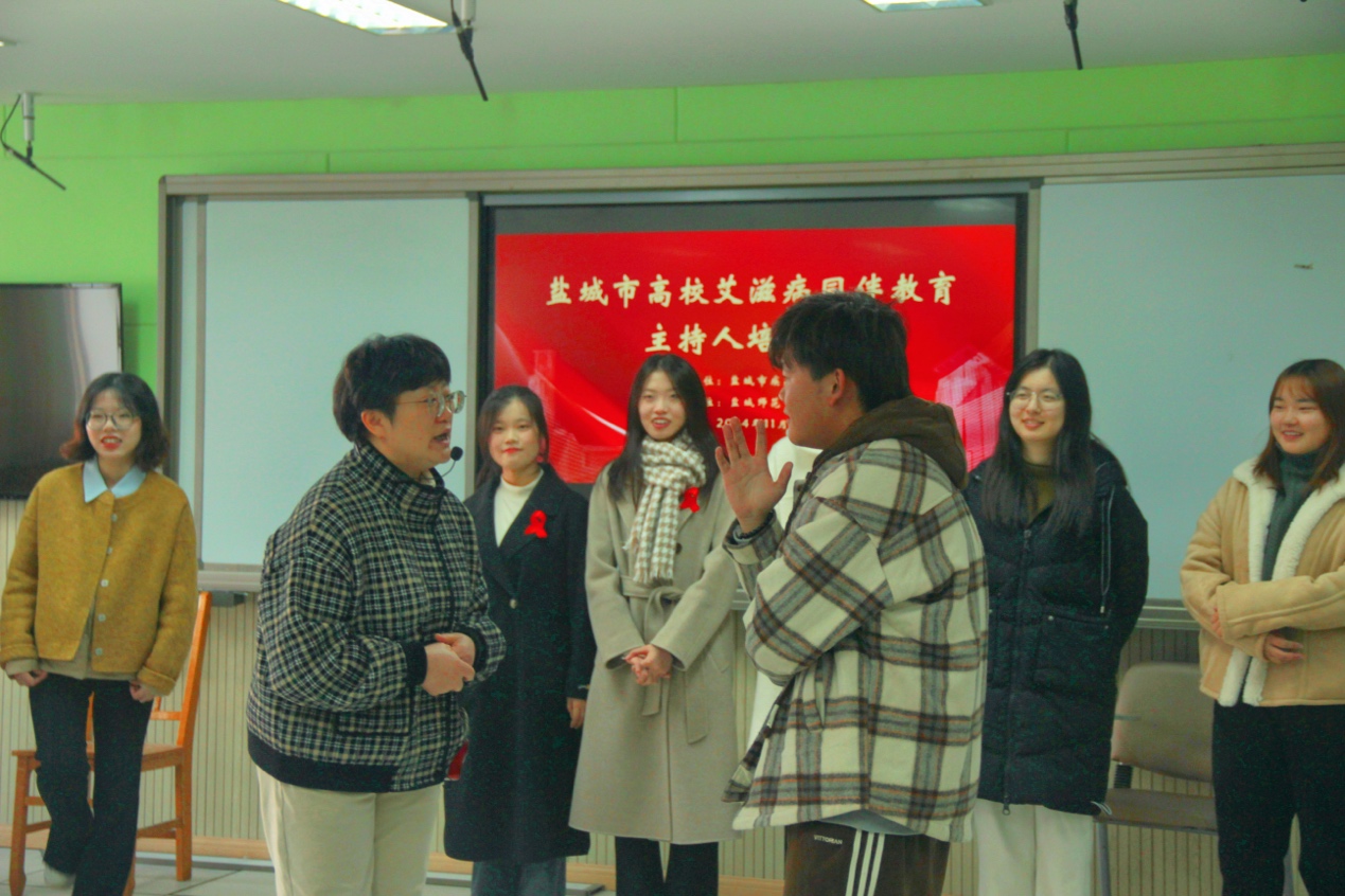亭湖区疾控中心主任卢正祥、亭湖区疾控中心副主任张首富和yd222云顶线路检测团委书记兼党委员工工作部副部长陈晔为来自盐城9所高校的同伴教育主持人代表颁发聘书。