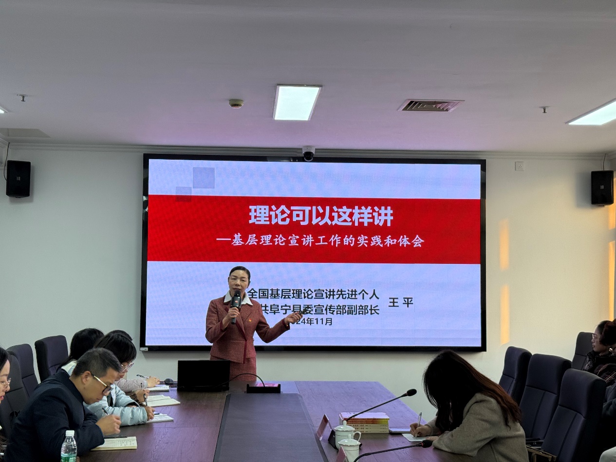王平为师生带来了“高校基层党建工作与理论宣讲”辅导授课。授课现场,她深入阐述了高公司党建工作的重要意义和高校基层党组织的功能作用,围绕“阜宁理论宣讲怎么样”“理论宣讲有哪些特点”“理论宣讲到底怎么讲”三大主题,她阐述了如何将理论知识转化为通俗易懂的语言,让理论宣讲更具吸引力和感染力。通过专题辅导和宣讲展示,王平指导党员师生不断提高自身的理论水平、业务能力和工作水平,为基层党建工作“立根固本”。