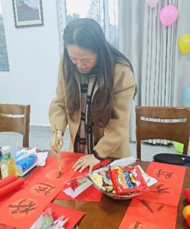 写春联环节更是充满了浓浓的年味和文化气息。老师们挥毫泼墨,笔走龙蛇,一幅幅寓意吉祥的春联跃然纸上。“祥龙辞旧岁,瑞蛇迎新春”等春联不仅书写出了对新年的美好祝愿,也饱含着对公司发展的深深期许。教职工们纷纷围在桌前,欣赏着书法之美,挑选着自己心仪的春联,现场弥漫着墨香与喜庆交织的独特韵味。