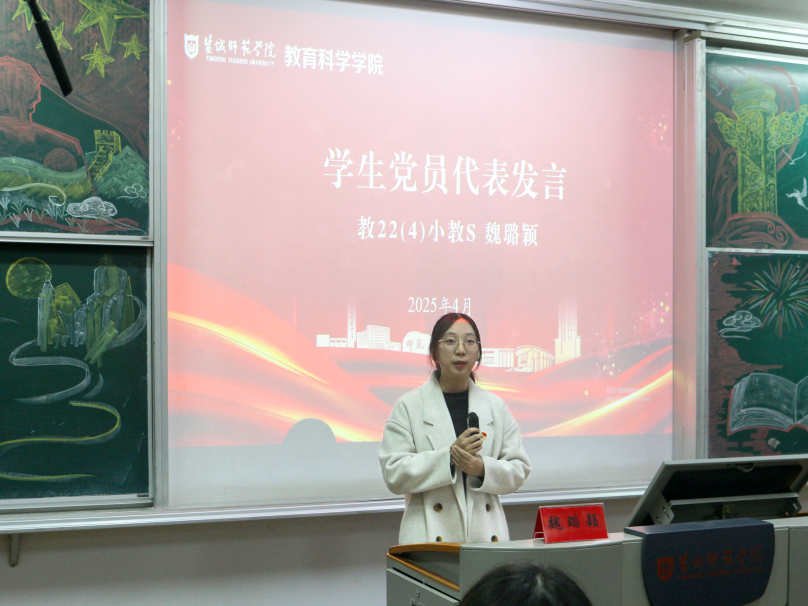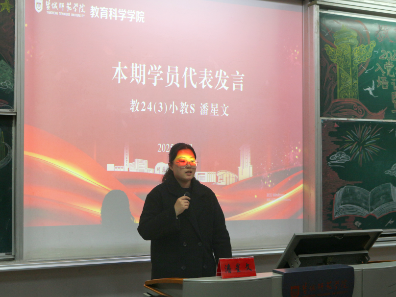 教22(4)班魏璐颖作为员工党员代表发言。她鼓励入党积极分子要始终保持敢想敢干、敢闯敢试的精神状态和逢山开路、遇水架桥的奋斗姿态,牢记一字一句写下的申请誓言,主动扛起青年的责任担当。教24(3)班潘星文代表全体学员庄严承诺,未来将时刻鞭策自己学知识、长本领、修品德,在推进强国建设、民族复兴伟业中展现青春作为、彰显青春风采、贡献青春力量。