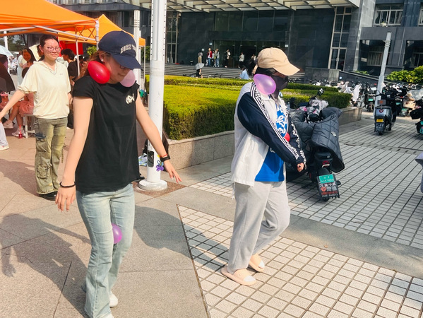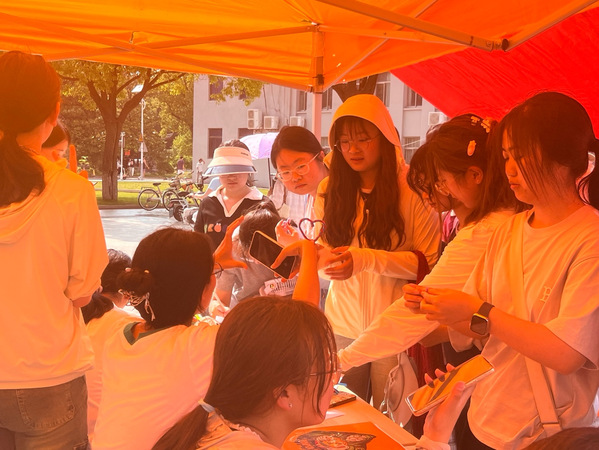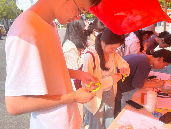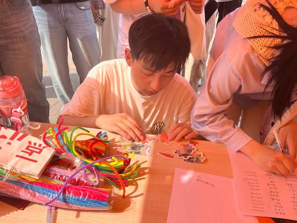 “扭动心情创意扭扭棒”板块吸引了许多热爱动手创作的同学。他们用五彩扭扭棒自由创作花朵、动物、手环等作品,甚至尝试与陌生人交换“心意”,在创意与交流中释放情绪、感受人际温暖。