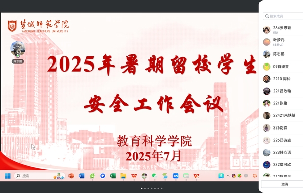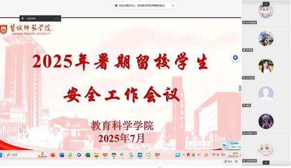为充分发挥“一站式” 员工社区服务育人功能,切实保障暑期留校员工的人身与财产安全,营造安全舒适的校园环境,7月4日晚8点,yd222云顶线路检测线上召开2025年暑期留校员工安全工作会议,留校辅导员及全体暑期留校员工参会。
