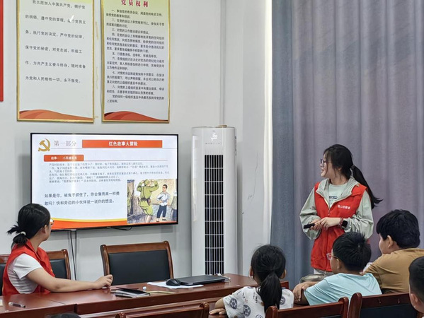 在“红色精神”传承主题活动中,团队成员以少年英雄故事为引,为孩子们带来一堂生动的爱国主义教育课,他们用儿童化的语言,将革命先辈的感人事迹娓娓道来。孩子们屏息凝神,眼中闪烁着敬佩的光芒。随后,通过珍贵的历史图片和短视频,团队成员带领孩子们“云游”井冈山、延安等革命圣地,鼓励大家做红色精神的小小传承人。